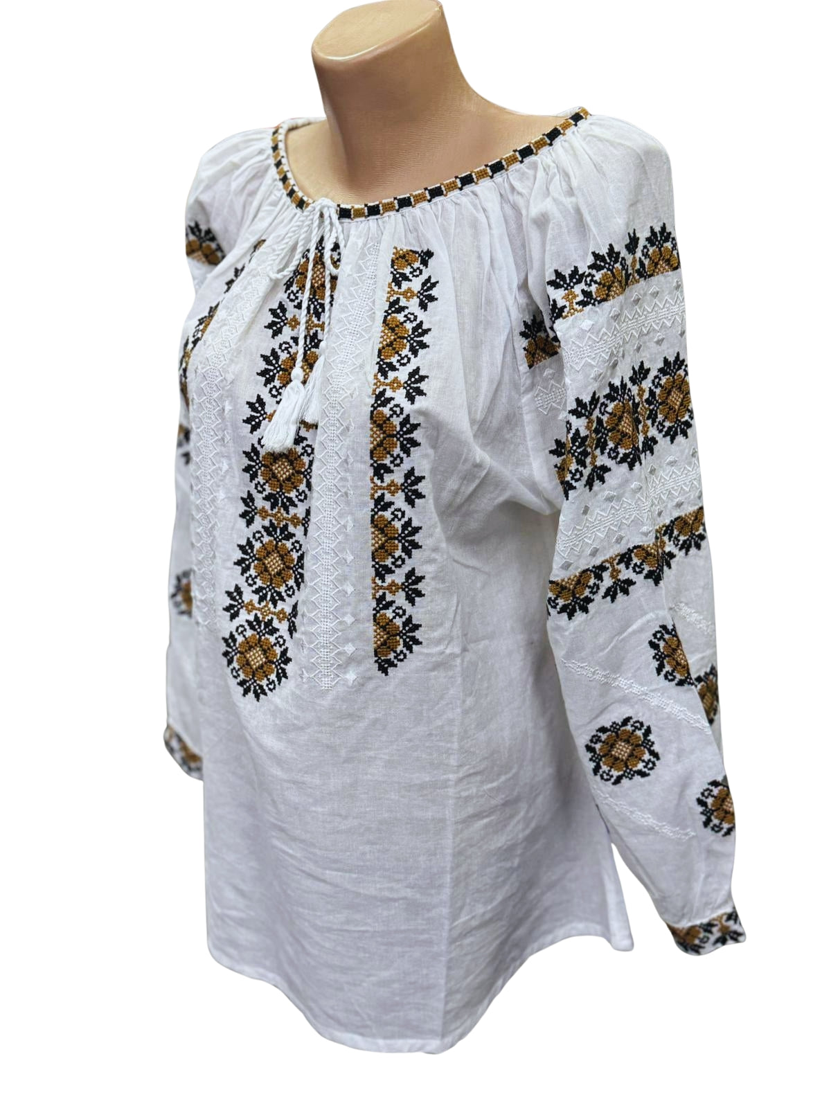 Confecționată din 100% bumbac, această ie tradițională asigură confort și respirabilitate. Broderia florală, realizată cu grijă, adaugă un plus de eleganță și autenticitate. Model cu guler rotund și mâneci lungi, potrivit pentru orice ocazie.